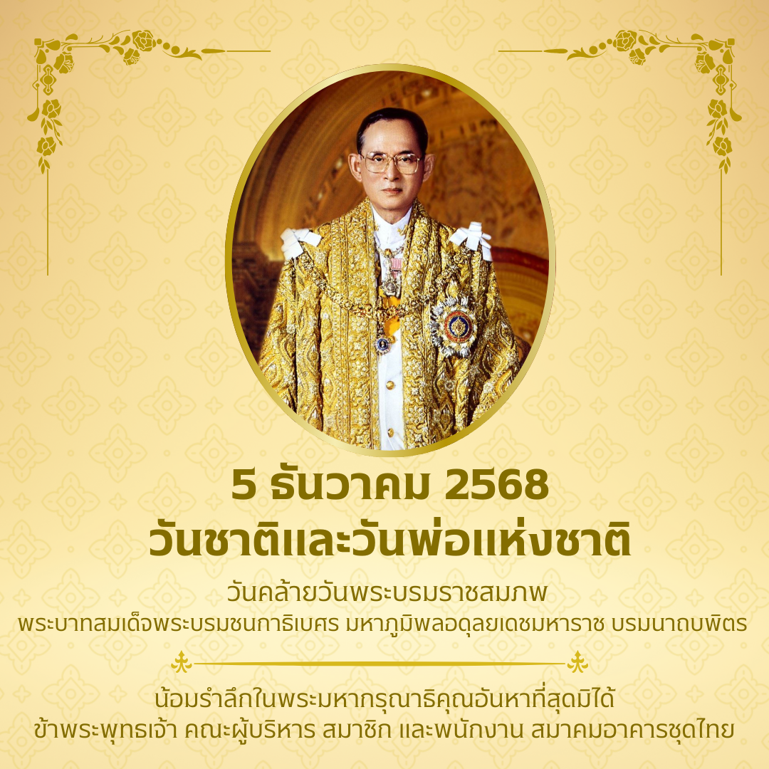 5 ธันวาคม 2568 วันคล้ายวันพระราชสมภพ พระบาทสมเด็จพระบรมชนกาธิเบศร มหาภูมิพลอดุลยเดชมหาราช บรมนาถบพิตร วันชาติและวันพ่อแห่งชาติ น้อมรำลึกในพระมหากรุณาธิคุณอันหาที่สุดมิได้ ข้าพระพุทธเจ้า คณะผู้บริหาร สมาชิก และพนักงาน สมาคมอาคารชุดไทย