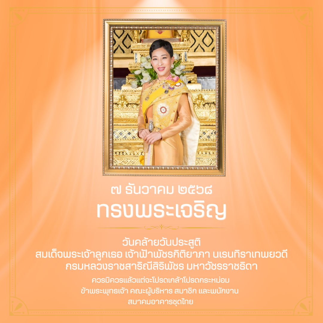 ๗ ธันวาคม ๒๕๖๘ ทรงพระเจริญ วันคล้ายวันประสูติ สมเด็จพระเจ้าลูกเธอ เจ้าฟ้าพัชรกิติยาภา นเรนทิราเทพยวดี กรมหลวงราชสาริณีสิริพัชร มหาวัชรราชธิดา ควรมิควรแล้วแต่จะโปรดเกล้าโปรดกระหม่อม ข้าพระพุทธเจ้า คณะผู้บริหาร สมาชิก และพนักงาน สมาคมอาคารชุดไทย