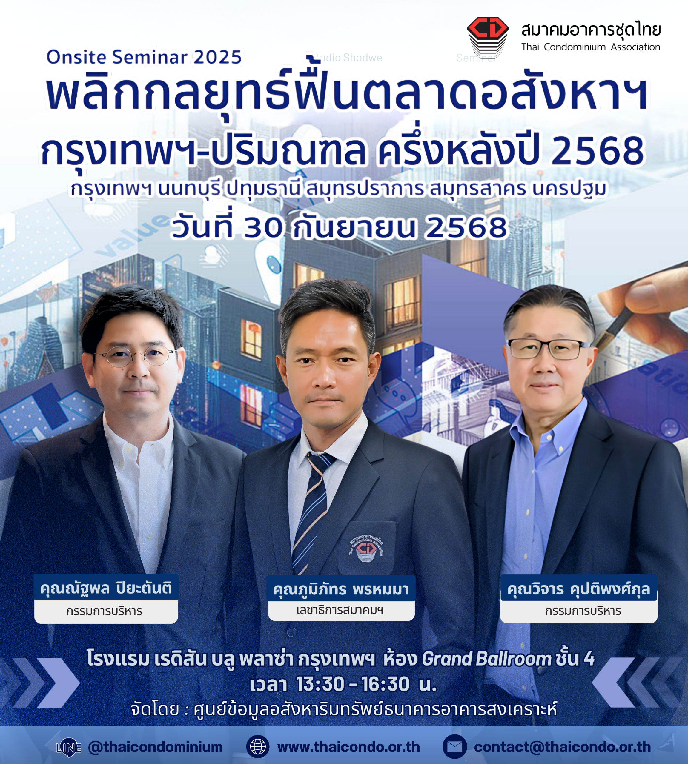 สมาคมอาคารชุดไทย นำโดย 👨💼 คุณภูมิภัทร พรหมมา เลขาธิการสมาคมฯ 👨💼 คุณวิจาร คุปติพงศ์กุล กรรมการบริหารสมาคมฯ 👨💼 คุณณัฐพล ปิยะตันติ กรรมการบริหารสมาคมฯ ⚡เข้าร่วมฟังสัมมนา “พลิกกลยุทธ์ฟื้นตลาดอสังหาฯ กรุงเทพฯ-ปริมณฑล ครึ่งหลังปี 2568” 📊 Highlight Topics 🔹 ภาพรวมตลาดที่อยู่อาศัยกรุงเทพฯ-ปริมณฑล จากผลการสำรวจภาคสนาม ไตรมาส 2 ปี 2568 🔹 ฝ่าวิกฤตบริหารการเงิน ทางรอดอสังหาริมทรัพย์ไทย 📅 วันอังคารที่ 30 กันยายน 2568 ⏰ เวลา 13:30 - 16:30 น. 🏨 โรงแรม Radisson Blu Plaza Bangkok ห้อง Grand Ballroom ชั้น 4 🎯 จัดโดย : ศูนย์ข้อมูลอสังหาริมทรัพย์ ธนาคารอาคารสงเคราะห์