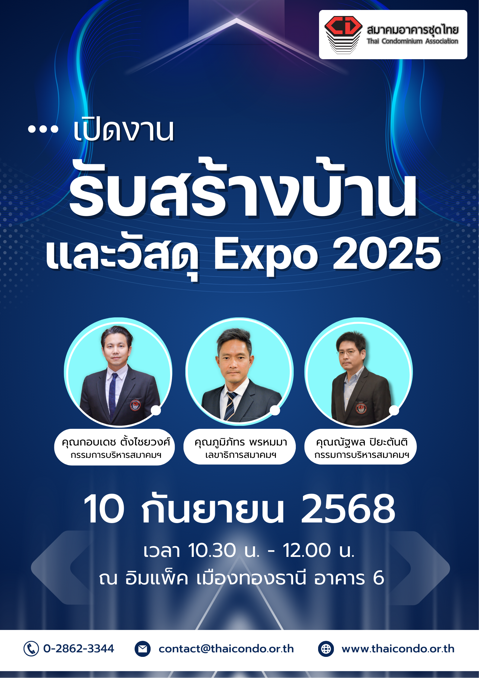 📣 สมาคมอาคารชุดไทย โดย คุณภูมิภัทร พรหมมา เลขาธิการสมาคมฯ พร้อมด้วย คุณกอบเดช ตั้งไชยวงศ์ และ คุณณัฐพล ปิยะตันติ กรรมการบริหารสมาคมฯ 🏡เข้าร่วมพิธีเปิดงานรับสร้างบ้านและวัสดุ Expo 2025 🗓️ วันที่ 10 กันยายน 2568 📍 อิมแพ็ค เมืองทองธานี อาคาร 6 💡 พบกับผู้ประกอบการชั้นนำด้านรับสร้างบ้าน วัสดุก่อสร้าง และนวัตกรรมเพื่อที่อยู่อาศัยครบวงจร ✨ โอกาสดีในการเลือกสรร สร้างแรงบันดาลใจ และอัปเดตเทรนด์ใหม่ ๆ เพื่อบ้านในฝันของคุณ จัดโดย 🏢 สมาคมธุรกิจรับสร้างบ้าน