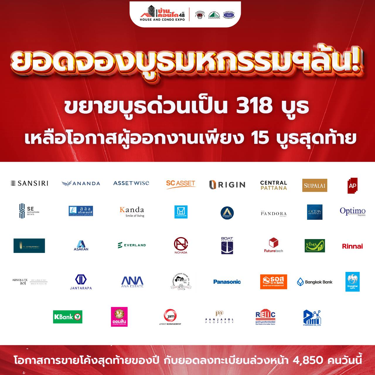 💎🏢 งานมหกรรมบ้านและคอนโด ครั้งที่ 48 💎📍 Hall 5 ชั้น LG ศูนย์การประชุมแห่งชาติสิริกิติ์🗓️ 30 ต.ค. – 2 พ.ย. 2568 🔥 โค้งสุดท้ายแห่งโอกาส!ยอดจองบูธทะลุแล้ว 303 บูธ จนต้องขยายเป็น 318 บูธตอนนี้ เหลือเพียง 15 บูธสุดท้าย เท่านั้น ‼️ 💥 กระแสแรงไม่หยุด!โอกาสการขายบ้านและคอนโดโค้งสุดท้ายของปีนี้ จากยอดลงทะเบียนเข้าชมงานล่วงหน้าแล้ว 4,850 ราย ✨ 🏘️ รวมโครงการที่อยู่อาศัยคุณภาพ🏦 สถาบันการเงินและสินเชื่อชั้นนำ💼 สินทรัพย์ NPA สำหรับนักลงทุน 🚀 สถิติใหม่ของงาน📊 ยอดจองบูธสูงสุดในรอบ 3 ปี📈 ผู้ลงทะเบียนเพิ่มขึ้นต่อเนื่อง 🎯 เวทีแห่งความสำเร็จและภาพลักษณ์ระดับประเทศ✅ สร้างการรับรู้และความเชื่อมั่น✅ ขยายฐานลูกค้าคุณภาพ✅ พบผู้เข้าชมงานนับหมื่น ที่พร้อมตัดสินใจซื้อ-ลงทุน 📲 จองพื้นที่ของคุณตอนนี้ ก่อนเต็ม 100%‼️☎️