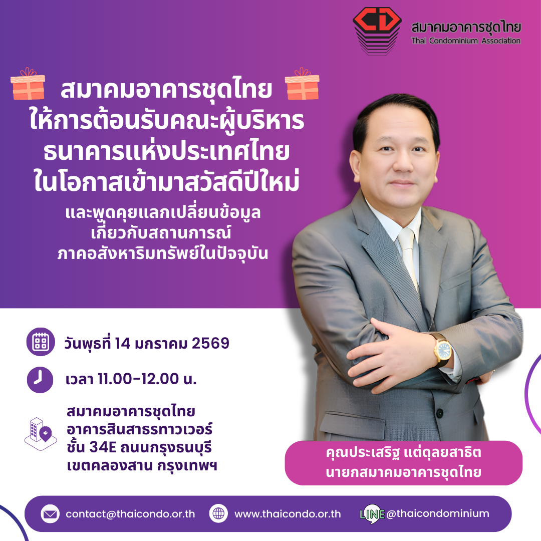 🏢 สมาคมอาคารชุดไทย 👥 โดย คุณประเสริฐ แต่ดุลยสาธิต นายกสมาคมอาคารชุดไทย ให้การต้อนรับ 🤝 คุณสักกะภพ พันธ์ยานุกูล ผู้ช่วยผู้ว่าการ สายนโยบายการเงิน ธนาคารแห่งประเทศไทย พร้อมคณะผู้บริหารฯ 🎉 ในโอกาสเข้าเยี่ยมสวัสดีปีใหม่ พุทธศักราช 2569 💬 พร้อมพูดคุยแลกเปลี่ยนข้อมูลเกี่ยวกับ สถานการณ์ ภาคอสังหาริมทรัพย์ในปัจจุบัน 📅 วันพุธที่ 14 มกราคม 2569 ⏰ เวลา 11.00 น. 📍 ณ สมาคมอาคารชุดไทย อาคารสินสาธรทาวเวอร์ ชั้น 34E ถนนกรุงธนบุรี