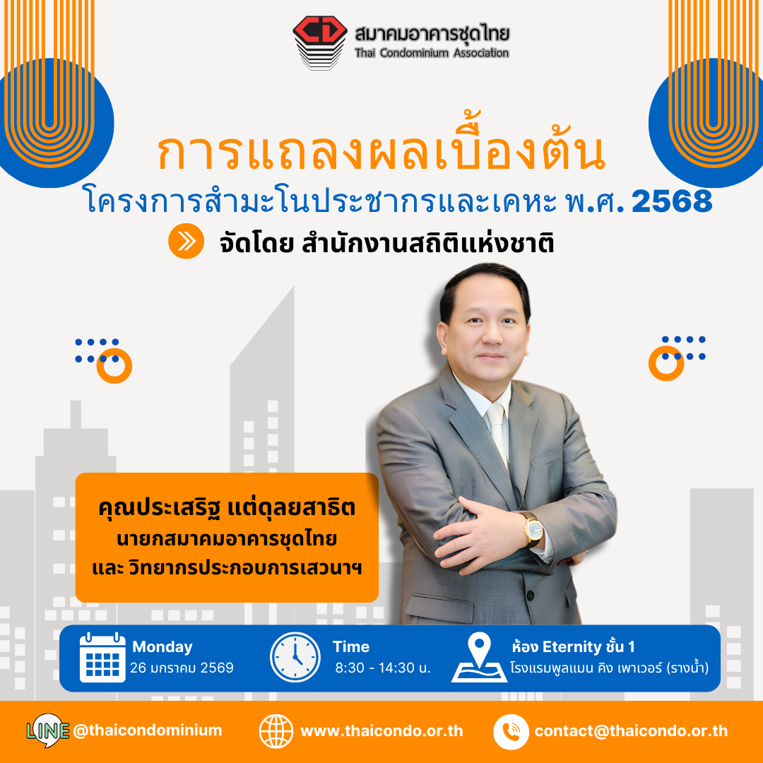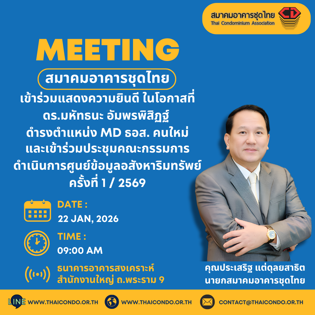 ✨🏢 สมาคมอาคารชุดไทย จัดการประชุมคณะกรรมการสมาคมฯ ครั้งที่ 1/2569 🏢✨ 👤 โดยได้รับเกียรติจาก คุณประเสริฐ แต่ดุลยสาธิต นายกสมาคมอาคารชุดไทย ร่วมบรรยายพิเศษ 📊 หัวข้อ “อัพเดทสถานการณ์อสังหาริมทรัพย์ในปัจจุบัน 🏗️ 🗓️ในวันพุธที่ 4 กุมภาพันธ์ 2569 ⏰ เวลา 15.30 – 17.30 น. 📍 ห้อง MR 107A ชั้น 1 ศูนย์การประชุมแห่งชาติสิริกิติ์ ถนนรัชดาภิเษก 🔹 ร่วมรับฟังมุมมอง แนวโน้ม การปรับตัว และทิศทางอสังหาริมทรัพย์ไทยเพื่อการเติบโตอย่างยั่งยืน #สมาคมอาคารชุดไทย #ThaiCondominiumAssociation #ประชุมคณะกรรมการ #อสังหาริมทรัพย์ #คอนโดมิเนียม