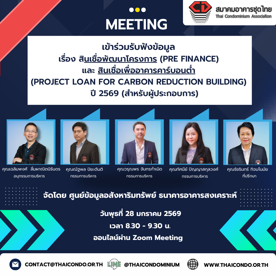 คณะกรรมการสมาคมอาคารชุดไทย เข้าร่วมรับฟังข้อมูลเบื้องต้นเกี่ยวกับการเข้าใช้บริการ 💰 สินเชื่อพัฒนาโครงการ (Pre Finance) 🌱สินเชื่อเพื่ออาคารคาร์บอนต่ำ (Project Loan For Carbon Reduction Building)     ปี 2569 (สำหรับผู้ประกอบการ) จัดโดย ศูนย์ข้อมูลอสังหาริมทรัพย์ ธนาคารอาคารสงเคราะห์ 🏢 🗓️ ในวันพุธที่ 28 มกราคม 2569 ⏰ เวลา 8.30 – 9.30 น. 📌 ผ่านโปรแกรม Zoom Meeting #สมาคมอาคารชุดไทย #ThaiCondominiumAssociation