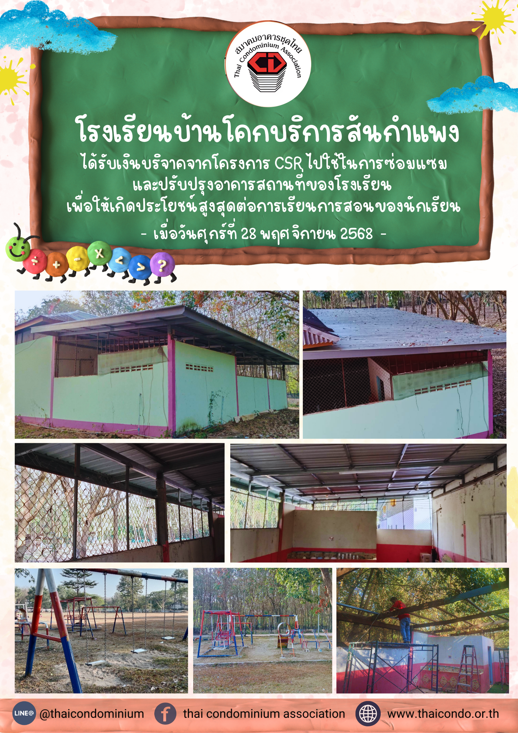 ✨📣 อัปเดตความคืบหน้ากิจกรรม CSRจากการร่วมบริจาคใน โครงการสานสัมพันธ์ ครั้งที่ 2/2568 🔔 🏫 โรงเรียนบ้านโคกบริการสันกำแพง จังหวัดบึงกาฬได้นำเงินบริจาคจากโครงการ CSRไปใช้ในการ ซ่อมแซมและปรับปรุงอาคารสถานที่ของโรงเรียนเพื่อให้เกิดประโยชน์สูงสุดต่อการเรียนการสอนและส่งเสริมสภาพแวดล้อมที่เหมาะสมสำหรับนักเรียน 💙 ขอขอบคุณทุกท่านที่ร่วมเป็นส่วนหนึ่งในการส่งต่อโอกาส และสร้างการเปลี่ยนแปลงที่ดีให้กับสังคมอย่างยั่งยืน #สมาคมอาคารชุดไทย#ThaiCondominiumAssociation