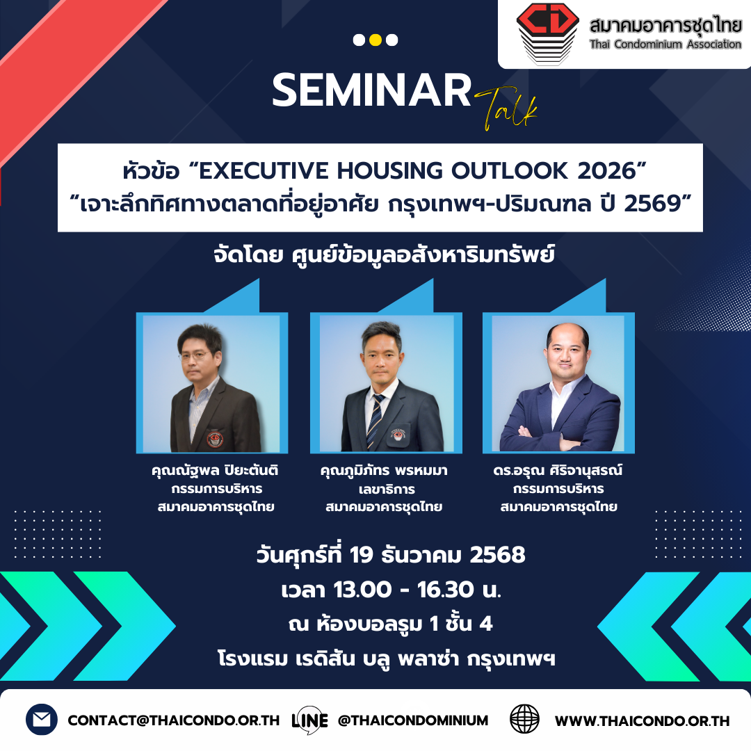 ✨📣 สมาคมอาคารชุดไทยโดย 👤คุณภูมิภัทร พรหมมา เลขาธิการสมาคมฯ👤คุณณัฐพล ปิยะตันติ กรรมการบริหาร สมาคมฯ และ 👤ดร.อรุณ ศิริจานุสรณ์ กรรมการบริหาร สมาคมฯ เข้าร่วมงานสัมมนา📌 Executive Housing Outlook 2026“เจาะลึกทิศทางตลาดที่อยู่อาศัย กรุงเทพฯ–ปริมณฑล ปี 2569” 📊🏢 📝 จัดโดย ศูนย์ข้อมูลอสังหาริมทรัพย์ 🗓️ ในวันศุกร์ที่ 19 ธันวาคม 2568⏰ เวลา 13.30 – 16.30 น.📍 สถานที่ ห้องบอลรูม 1 ชั้น 4โรงแรมเรดิสัน บลู พลาซ่า ถ.สุขุมวิท กรุงเทพฯ