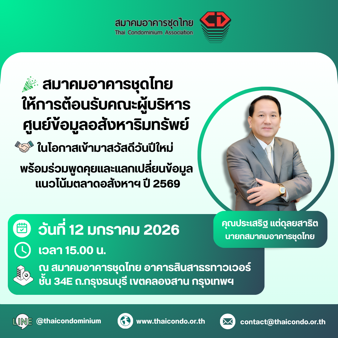 🏢 สมาคมอาคารชุดไทย 👥 โดย คุณประเสริฐ แต่ดุลยสาธิต นายกสมาคมอาคารชุดไทย ให้การต้อนรับ 🤝 คุณสักกะภพ พันธ์ยานุกูล ผู้ช่วยผู้ว่าการ สายนโยบายการเงิน ธนาคารแห่งประเทศไทย พร้อมคณะผู้บริหารฯ 🎉 ในโอกาสเข้าเยี่ยมสวัสดีปีใหม่ พุทธศักราช 2569 💬 พร้อมพูดคุยแลกเปลี่ยนข้อมูลเกี่ยวกับ สถานการณ์ ภาคอสังหาริมทรัพย์ในปัจจุบัน 📅 วันพุธที่ 14 มกราคม 2569 ⏰ เวลา 11.00 น. 📍 ณ สมาคมอาคารชุดไทย อาคารสินสาธรทาวเวอร์ ชั้น 34E ถนนกรุงธนบุรี